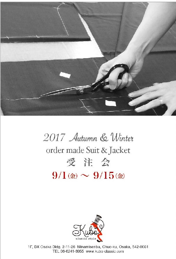 2017 秋・冬 オーダースーツ、ジャケットの受注会 2017.9.1(fri)~9.15(fri) 上記日程でオーダー会を開催いたします通常当店ではご用意できない生地も多数取り揃えておりますので是非この機会にご来店ください。*ご質問等ございましたらご遠慮なくメール、お電話にてお問い合わせください。*9月3日、10日(共に日曜日)は定休日です