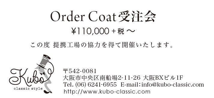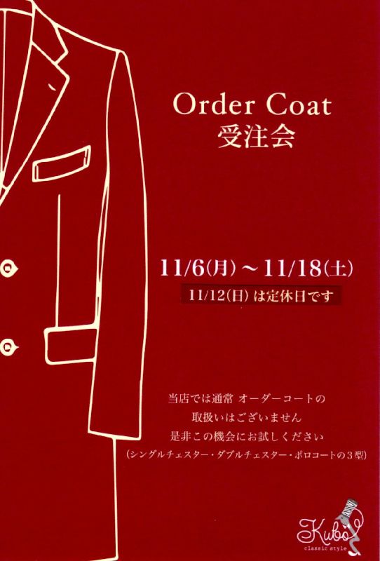 オーダーコートの受注会 2017.11.6(mon)~11.18(sat)上記の日程でオーダーコートの受注会を開催いたします。\110.000 + 税~コートのオーダーはこの期間限定となりますので、是非この機会にご来店ください。*ご質問等ございましたら ご遠慮なくメール、お電話にてお問い合わせください。*11月12日(日曜日)は定休日です。